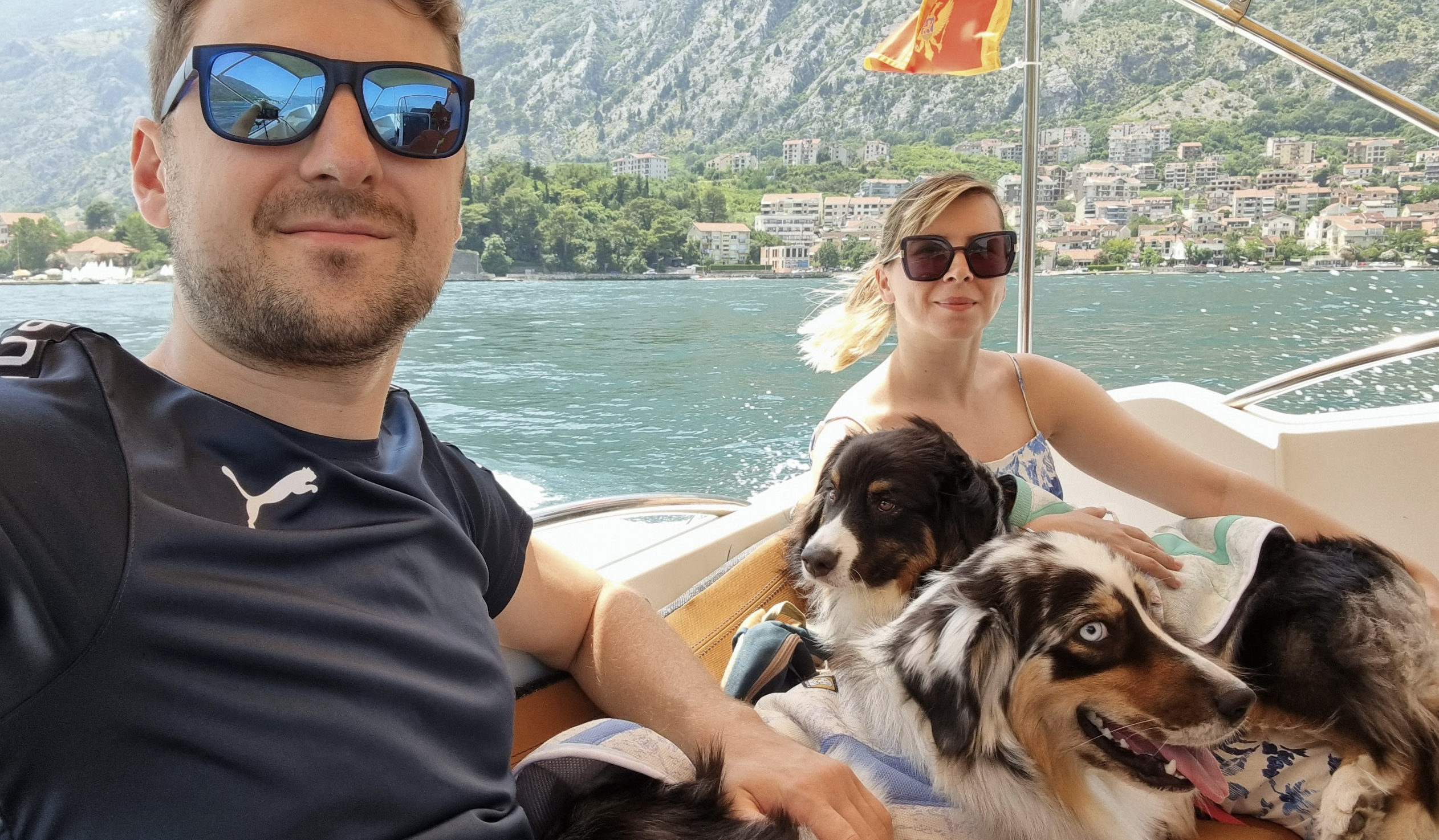 После обеда солнце уже жарило вовсю и возник вопрос чем бы заняться, но не на солнце. И тут я вспомнила пост догфрендлимап про катер! Нашли в интернете несколько катерных станций рядом с нами и пошли узнавать. На групповые экскурсии с собаками нельзя, но мы и не собирались. Взяли индивидуальную лодку, на которую без проблем пустили с пушистыми, и поехали осматривать Боко-Которскую бухту. Поездка была комфортной, капитан спокойно отнесся к собакам. Так как мы не планировали катание, то не брали с собой подстилок/пледов и сначала собачки ехали внизу. Но в какой-то момент Чарли стало мутить и я взяла его к себе на ручки, потом и Ева запрыгнула к нам. Капитан улыбался и фотографировал собак, так что мы расслабились. Самым сложным моментом было посадить и спустить собак с катера, т.к.их пугала качка. Муж заносил и выносил их на руках.