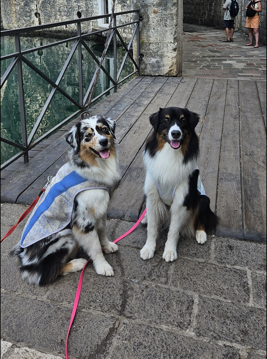 В первый день нашего путешествия мы поехали в старый город в Которе, чтобы оплатить регистрационный сбор и посмотреть сам город. В старый город въезд на автомобиле запрещен, зато с собаками можно гулять на поводках. Было достаточно комфортно, так как камень держит прохладу. На всякий случай, наши собаки были в охлаждающих попонах весь отпуск.