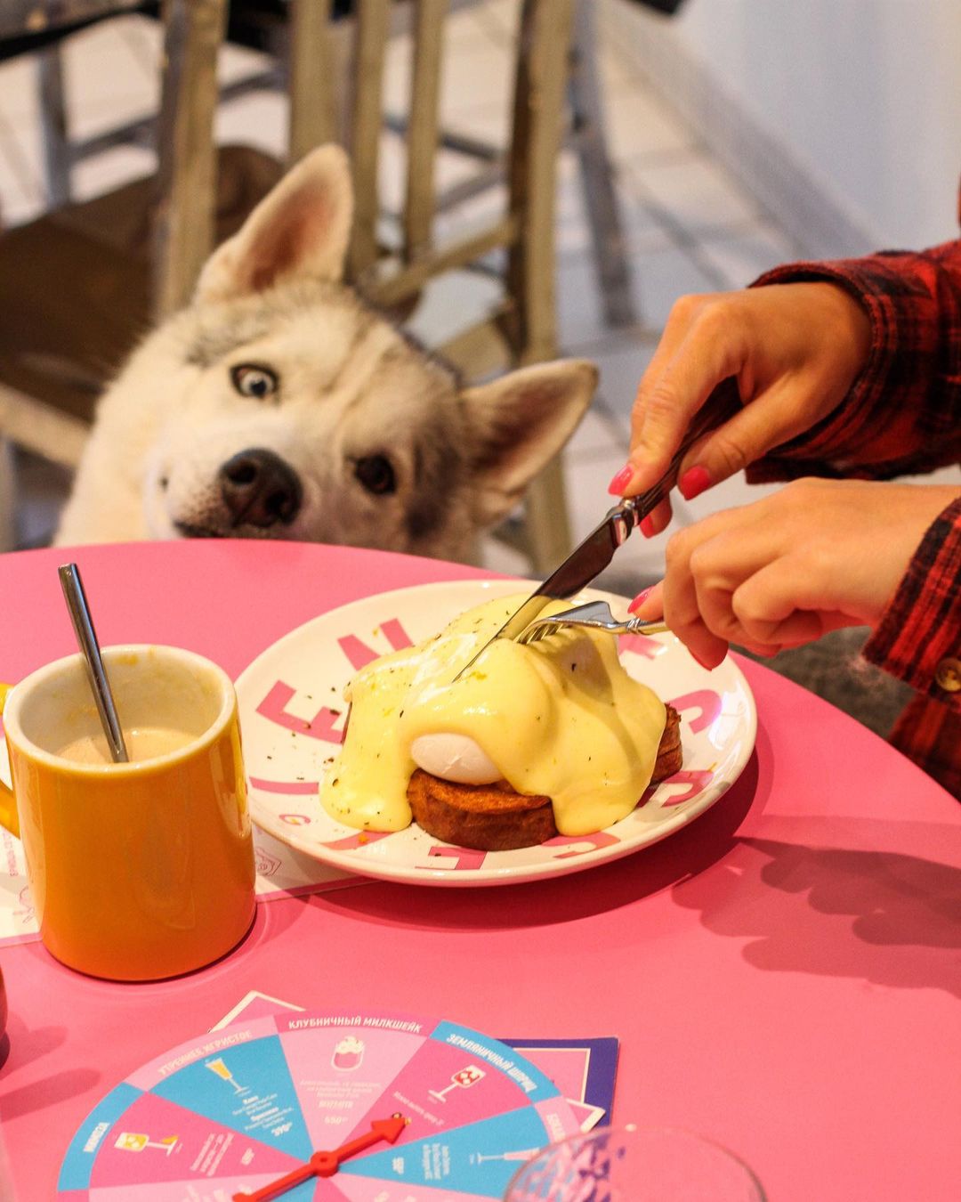 Проект Eggsellent.ru приехал к нам из Питера (кстати, маленький спойлер, в месте, где они располагаются в Питере, теперь тоже можно с собаками любых размеров, но подробнее об этом будет в другом посте). У ребят необыкновенно яркий и запоминающийся стиль во всём - от дизайна интерьера кафе, до необыкновенных сочетаний в меню.