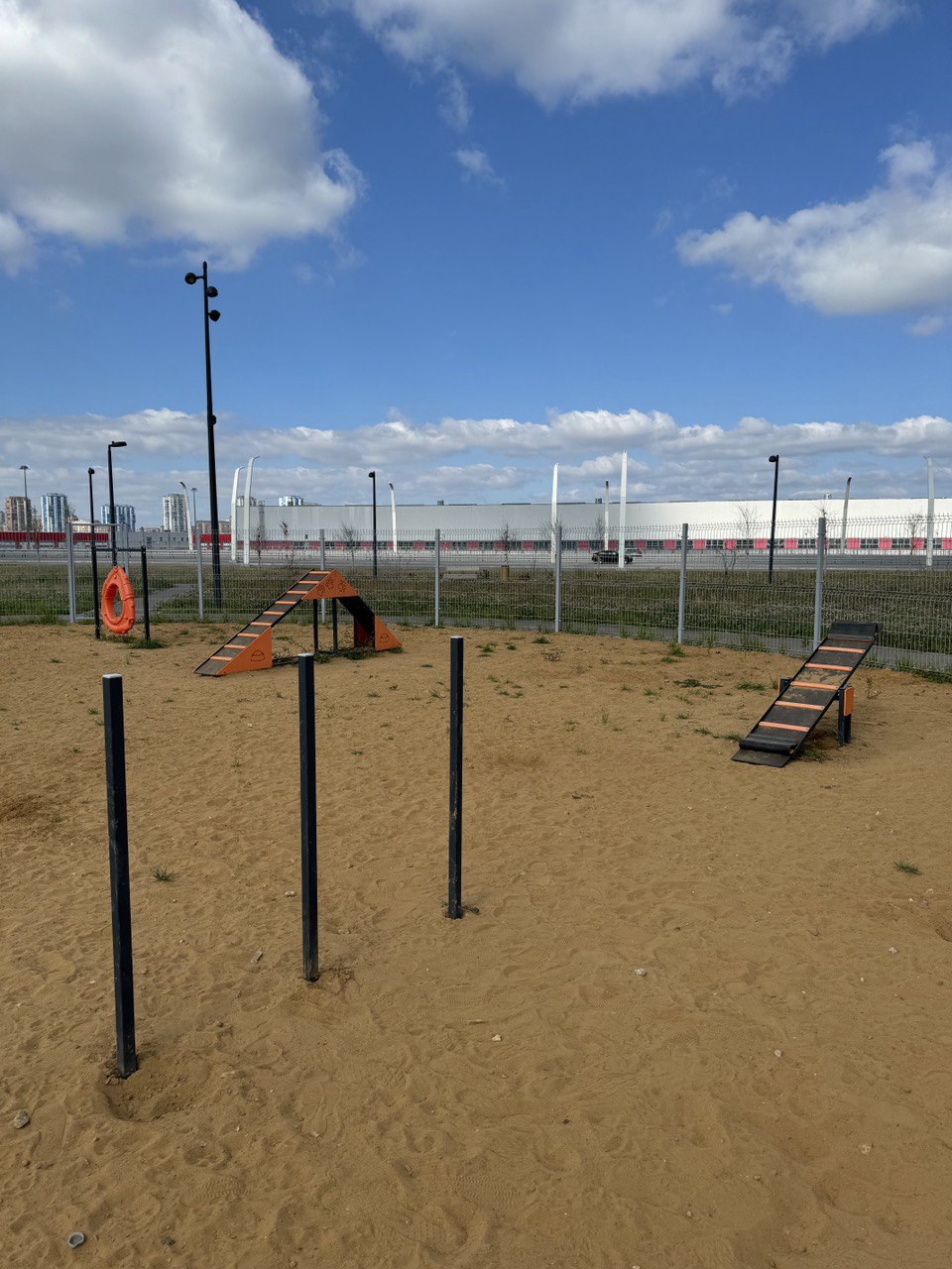 Собачья площадка с песчаным покрытием, снарядами и лежаками в парке в Некрасовке.