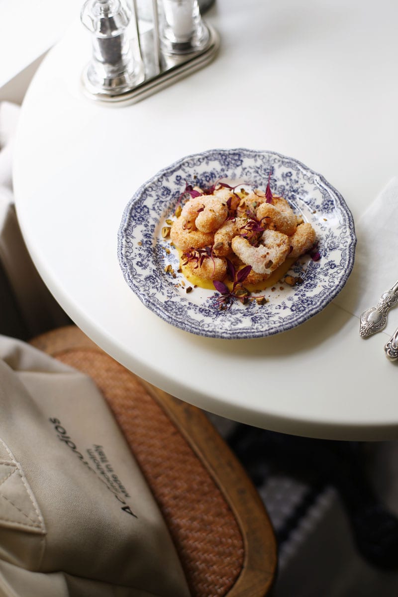 Мы попробовали фирменный завтрак с лососем, фисташковый эклер и кофе ☕️ Для Тори сразу же принесли водичку 💦